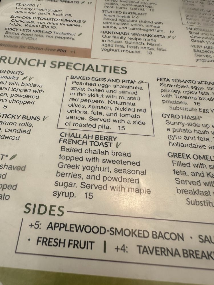 Scrambled eggs, tomatoes, parsley, spicy feta. Served with Taverna breakfast potatoes. Substitute Egg Whites for an upcharge
