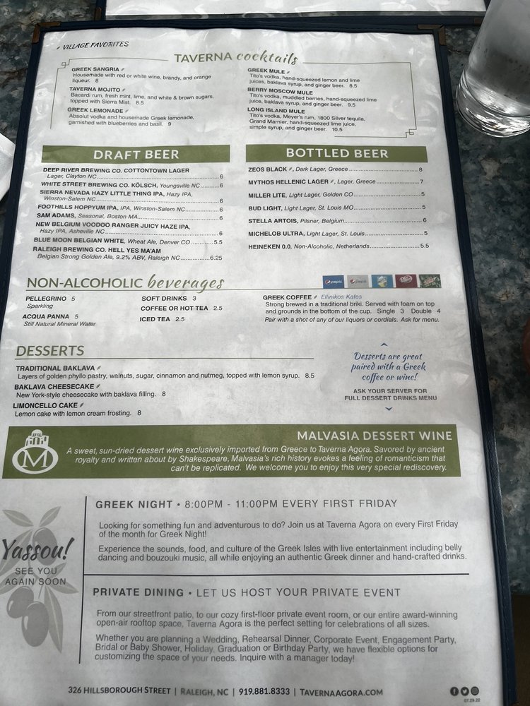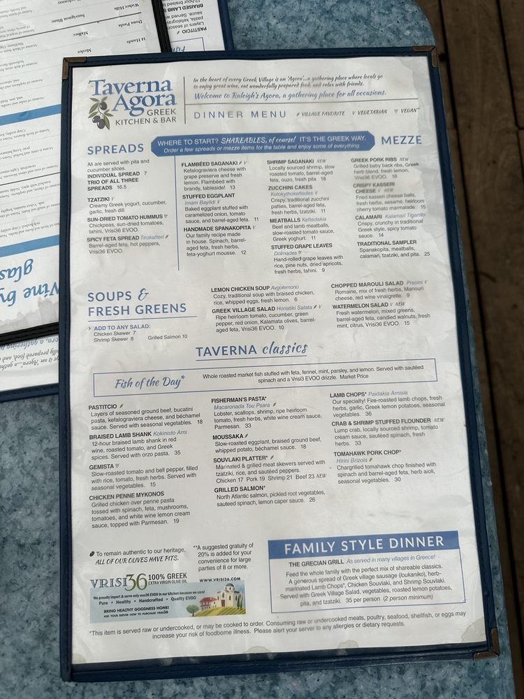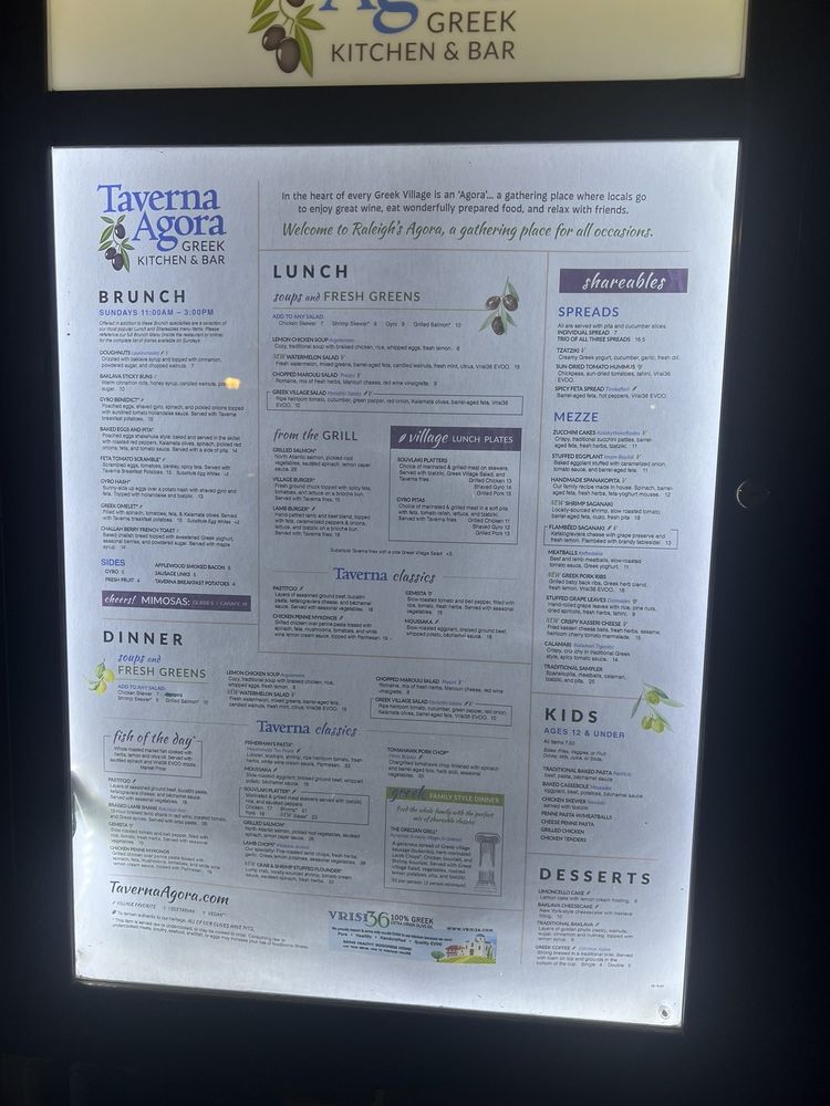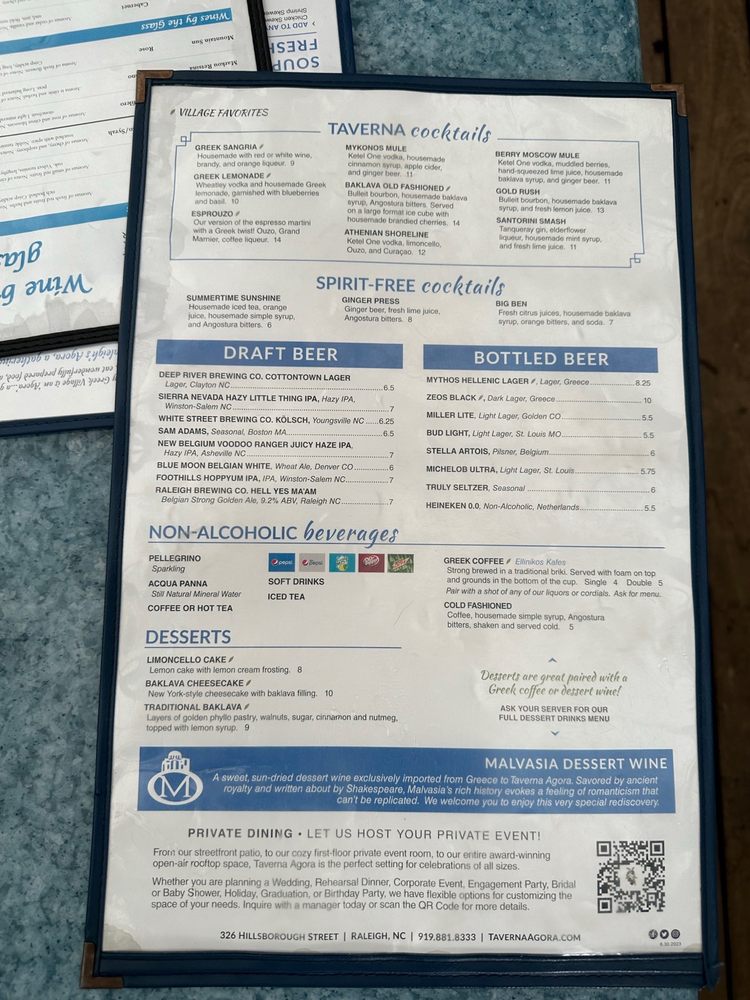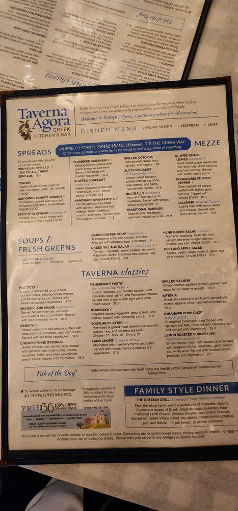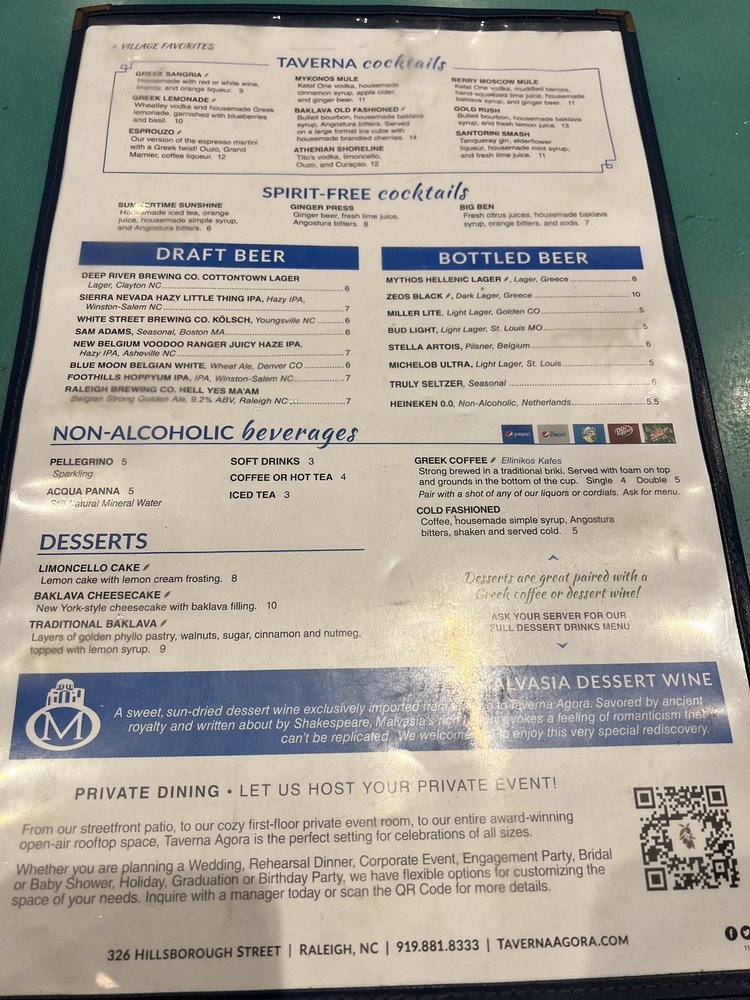 Introducing the menu at Taverna Agora, a Greek restaurant located in Raleigh, NC. The restaurant offers a variety of dishes, including Dolmades, flambéed saganaki, steak souvlaki platter, baklava, Greek omelette, tomato feta scramble, porkchop, lemon cake, and gyro hash. Customers have praised the quality and taste of the food, with highlights such as the flavorful pork chop, perfectly cooked branzino, gyro hash, and moussaka. The relaxed vibe, attentive service, and spacious seating areas, including a rooftop deck, contribute to a pleasant dining experience. With options for vegan and vegetarian dishes, as well as cocktails and desserts, Taverna Agora is a versatile and inviting spot for lunch, dinner, or dessert. The restaurant also offers amenities like outdoor seating, free Wi-Fi, and catering services, making it a suitable choice for various occasions.