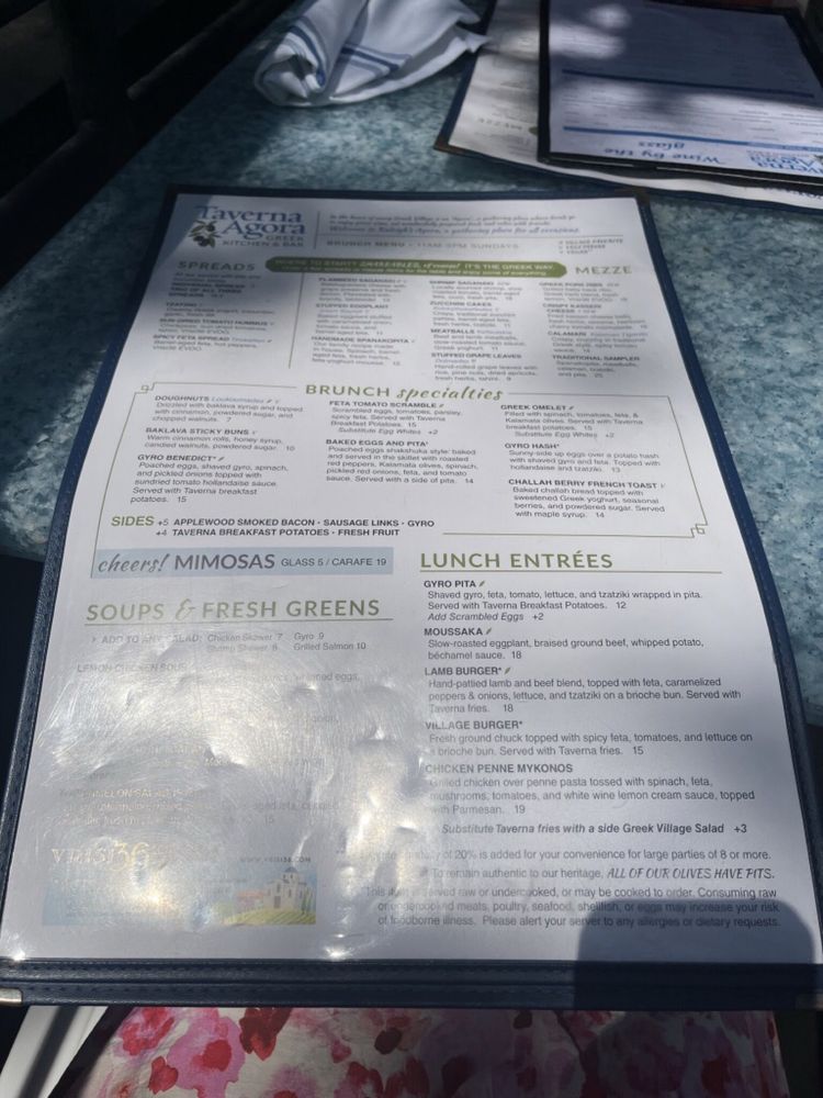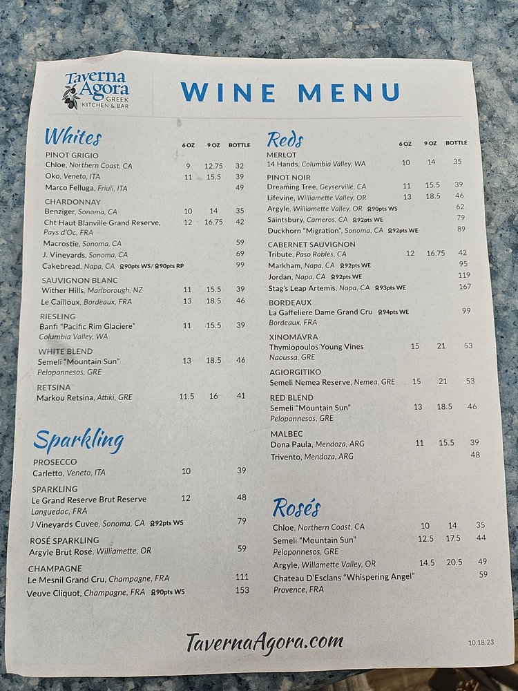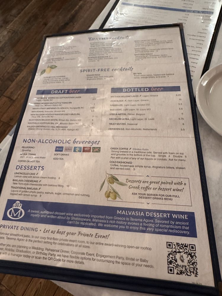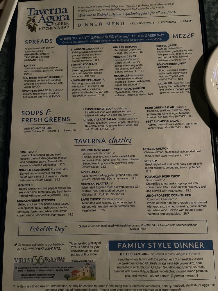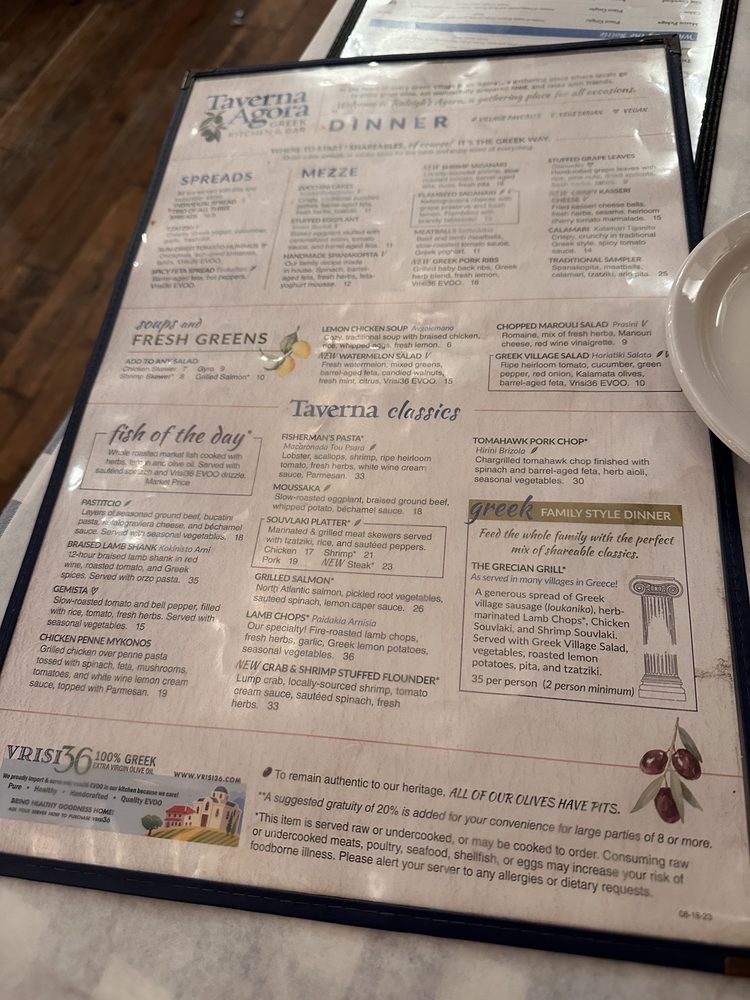 Introducing the menu at Taverna Agora, a Greek restaurant located in Raleigh, NC. The restaurant offers a variety of dishes, including Dolmades, flambéed saganaki, steak souvlaki platter, baklava, Greek omelette, tomato feta scramble, porkchop, lemon cake, and gyro hash. Customers have praised the quality and taste of the food, with highlights such as the flavorful pork chop, perfectly cooked branzino, gyro hash, and moussaka. The relaxed vibe, attentive service, and spacious seating areas, including a rooftop deck, contribute to a pleasant dining experience. With options for vegan and vegetarian dishes, as well as cocktails and desserts, Taverna Agora is a versatile and inviting spot for lunch, dinner, or dessert. The restaurant also offers amenities like outdoor seating, free Wi-Fi, and catering services, making it a suitable choice for various occasions.